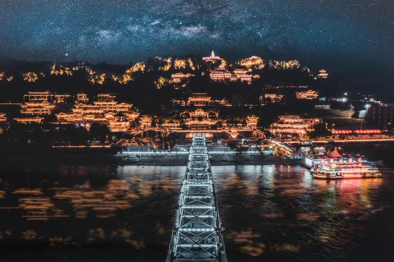 航拍金城的中山桥夜景,淌不完的黄河水向东流 。