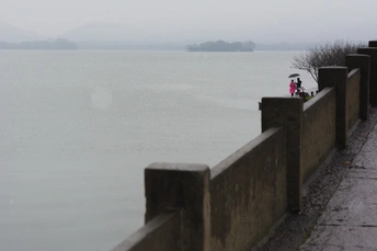 作品拍摄于2022年2月17日杭州西湖断桥。杭州因疫情的影响,杭州西湖游客很少。一对情侣正从白堤走来。