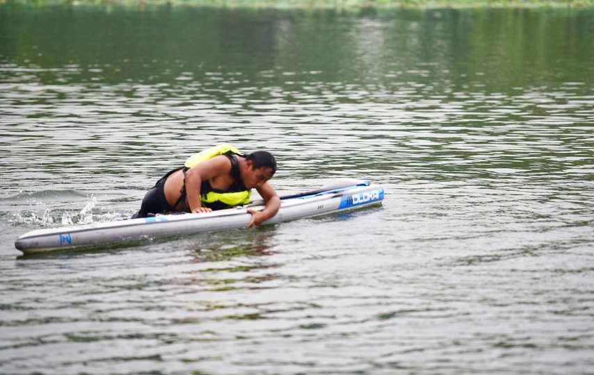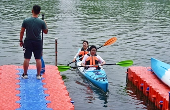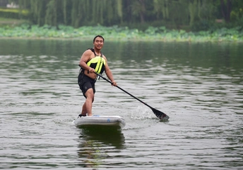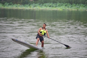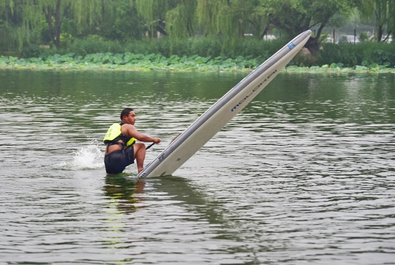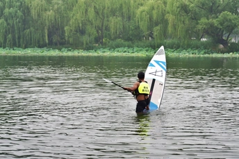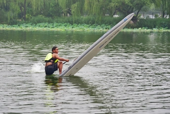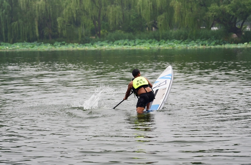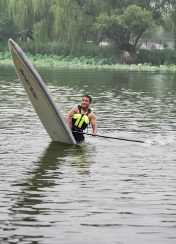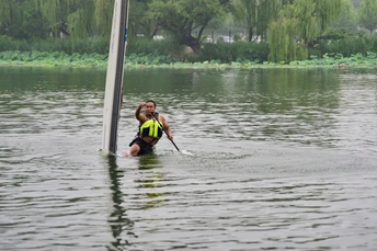 舢板是用桨划的小木船,作救护之用。 这是在朝阳公园里拍的照片,水上救生员在演示高难度动作,在雨中风采依旧。