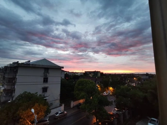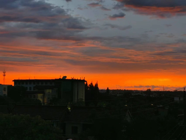 作者在学校里拍的。晚上下了雷暴雨,学校跳闸了。校园竹林被劈了,火花四溅。后来晚自习时终于回复电力了。快下课时外面天就变的橘红了,全都盯着外面看……下课后全都向阳台跑,发现其他班也都跑出来看晚霞了……作者发现有其他老师出来拍照,就大胆回教室和老师借了手机,没想到居然同意了!于是就在众人的簇拥下去了顶楼窗口拍照,哈哈