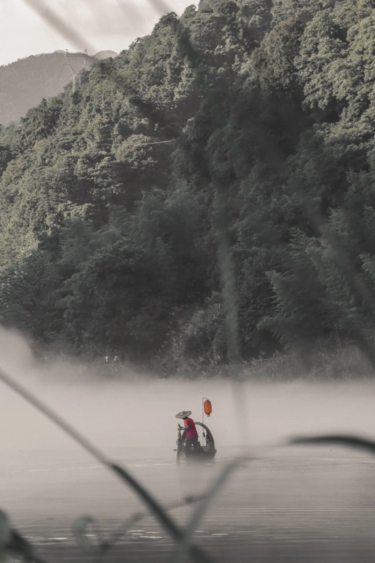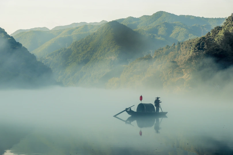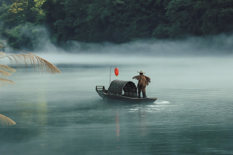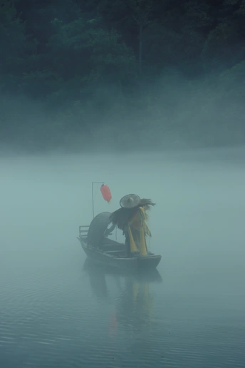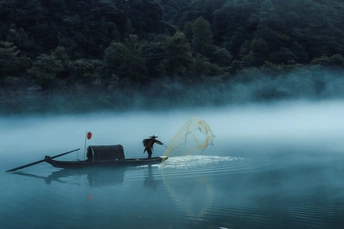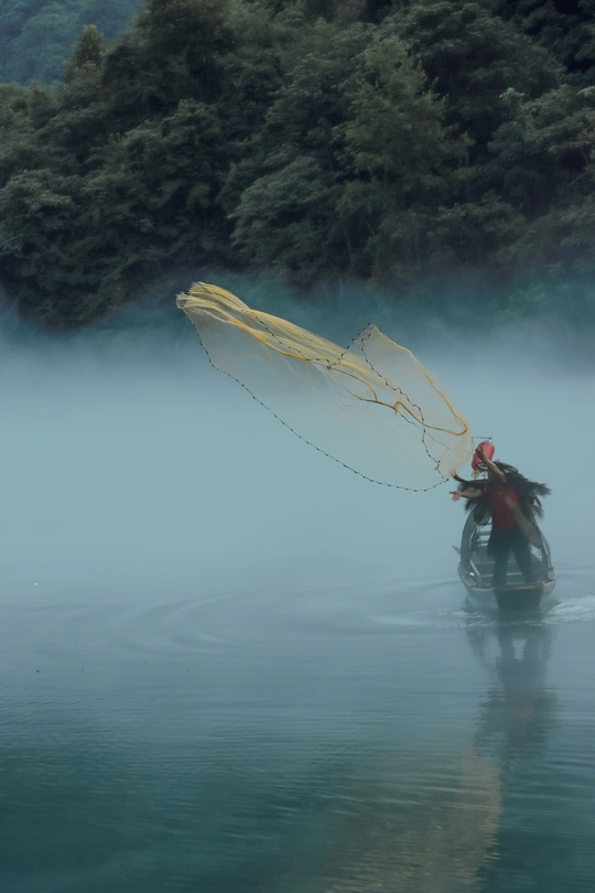 金黄色的晨光洒在东江面上,迷雾漫漫,渔夫身着蓑衣撒网捕鱼,好一片安静祥和世外桃源的氛围