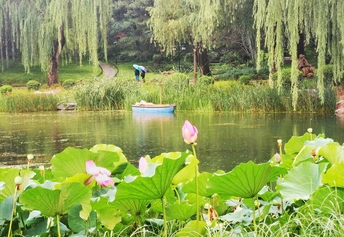 荷花已遍布京城各大公园,7月3日周日雨,陶然亭公园如往常周末一样游人如梭。从荷塘观景,游人在欣赏雨中百坡亭的景色。