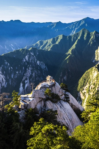 华山,古称“西岳”,是我国著名的五岳之一,位于陕西省华阴市境内,距西安120公里,秦、晋、豫黄河金三角交汇处,南接秦岭,北瞰黄渭,扼大西北进出中原之门户,素有“奇险天下第一山”之称。华山系一块完整硕大的花岗岩体构成,其历史衍化可追溯至27亿年:《山海经》载:“太华之山,削成而四方,其高五千仞,其广十里。”华山之险居五岳之首,有“华山自古一条路”的说法。 华山有东、西、南、北、中五峰,主峰有三:南峰“落雁”,为太华极顶,海拔2160.5米;又有东峰“朝阳”,西峰“莲花”,三峰鼎峙,“势飞白云外影倒黄河里”,人称“天外三峰”。云台、玉女二峰相辅于侧,36小峰罗列于前,虎踞龙盘,气象森森,文人谓之西 京王气之所系。山上奇峰、怪石、云海、鸣泉、飞瀑、古迹遍布,著名景点多达210余处有凌空架设的长空栈道,三面临空的鹞子翻身,以及在峭壁绝崖上凿出的千尺幢、百尺峡、老君犁沟、上天梯、苍龙岭等。华岳仙掌被列为关中八景之首。因山上气候多变,形成的“云华山”、“雨华山”、“雾华山”、“雪华山”给人以仙境美感。