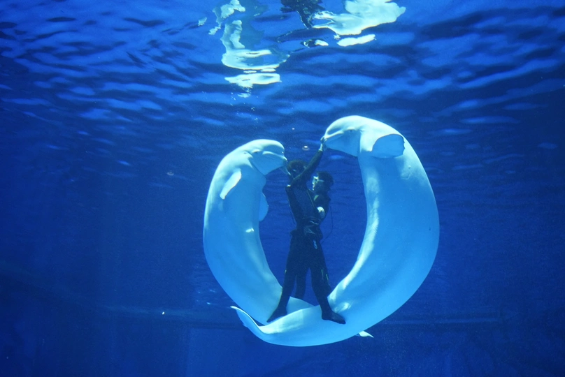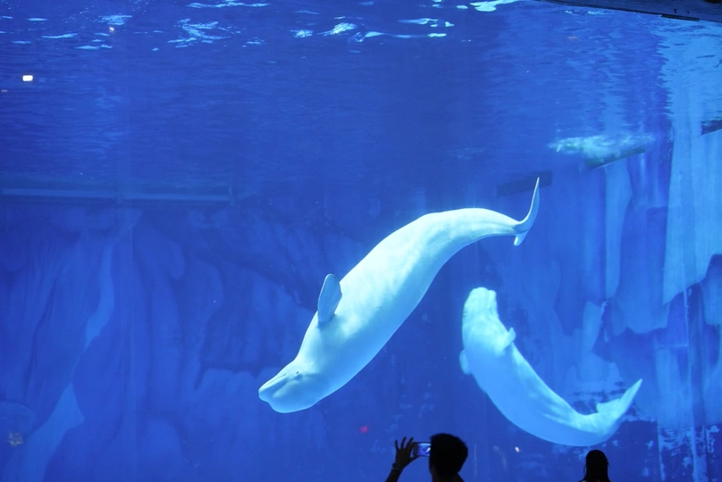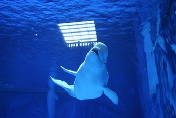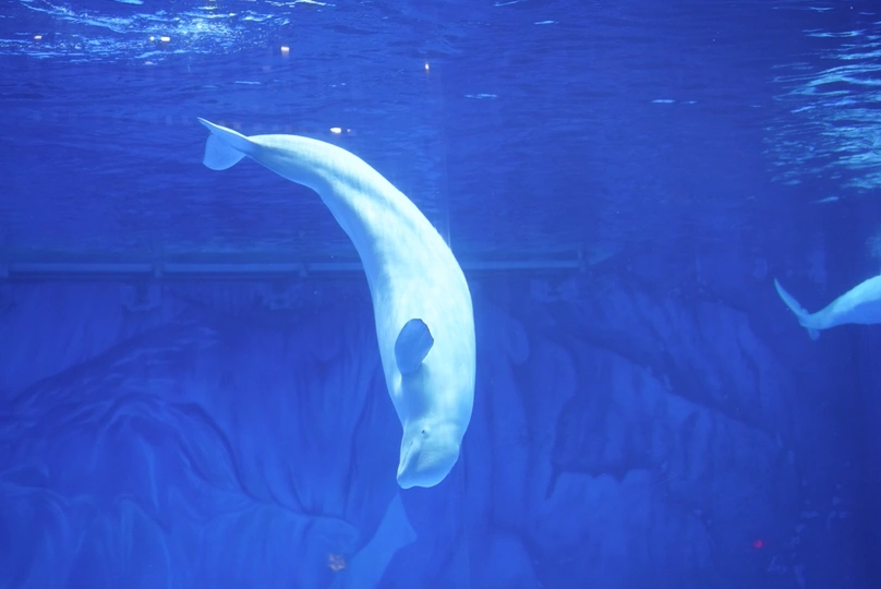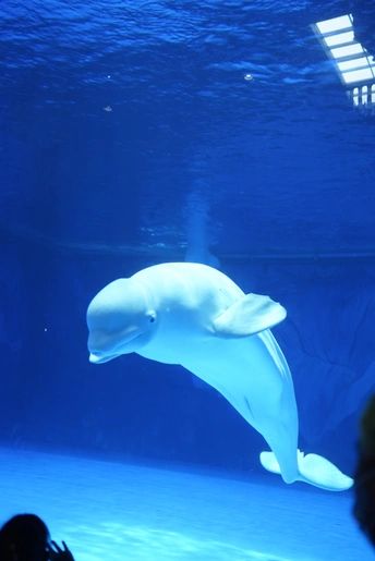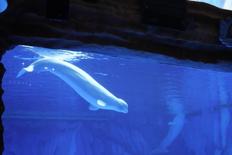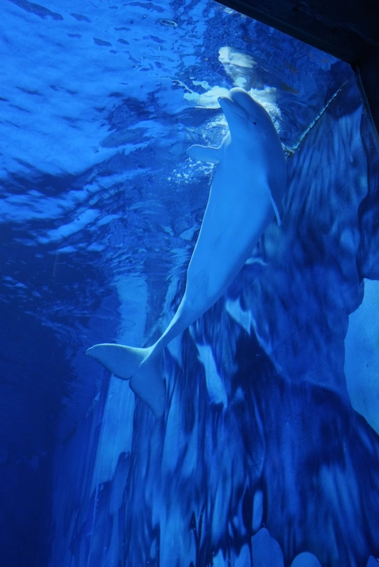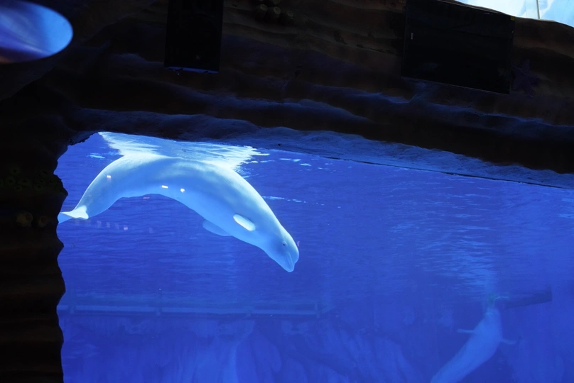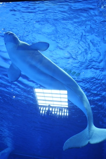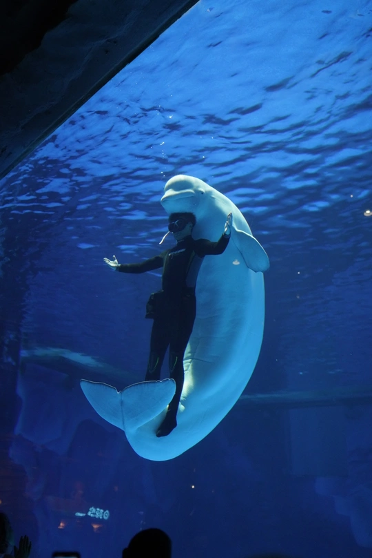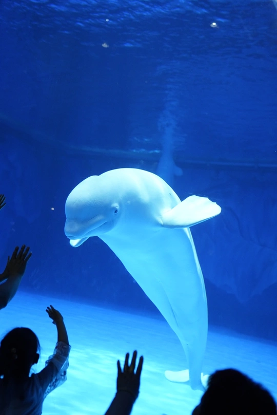 白鲸,听说是一种被称为鲸的豚类,也是难得没有背鳍却能够不影响泳姿的鲸,在巨大的水族箱里有两条白鲸,在没表演前其中的一条显得很活泼,闲不住地在水里不停地展示着他(她)的泳姿(注:我不知道怎么分雌雄),还会像个孩子似的跟玻璃前的小朋友们对视和打招呼,相比于表演时的刻意和刻板,我总觉得闲暇时的他们显得更加自在灵动。想来他们也是向往自由的。