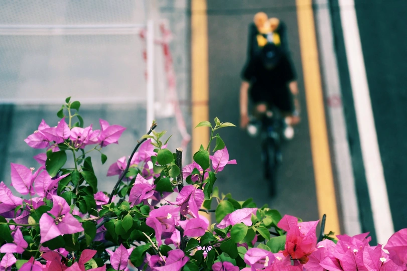本图拍摄于天桥的花篮边,下面正在骑车送餐的小哥,与天桥上的花篮形遥相呼应,仿佛马上 就要奔向一个美好充满鲜花的世界,没有了平日的匆劳,奔向小康之路。