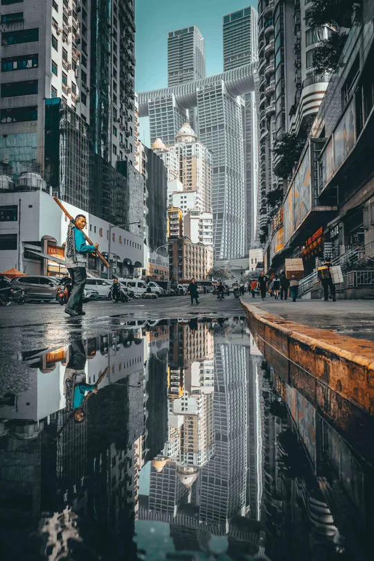 拍摄的时候刚好遇到环卫工在洒水,将图片倒立过来看会发现,图中的棒棒(力哥)仿佛穿越时空看到了以前的模样