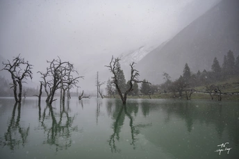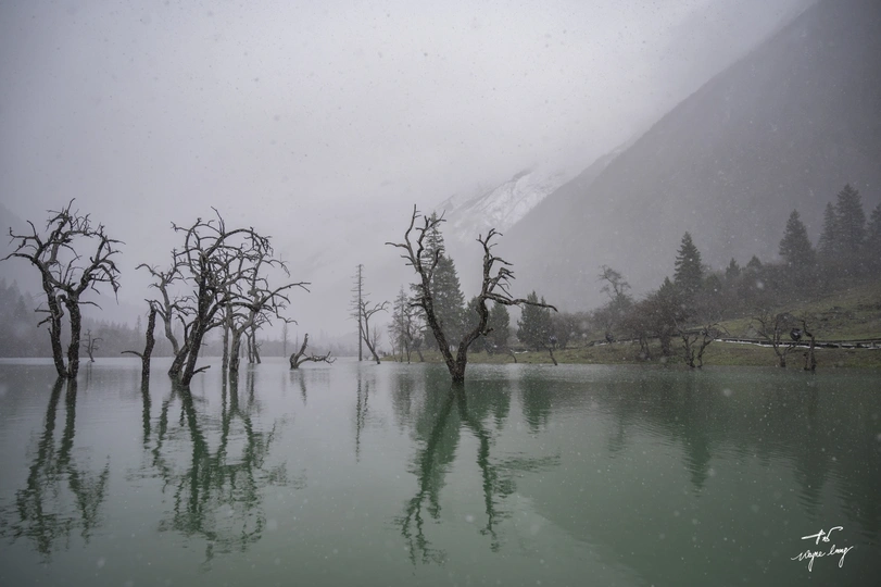 双桥沟中突降大雪,沟中朦胧神秘。雪中,海子里的枯木诉说着植被历史的变迁。