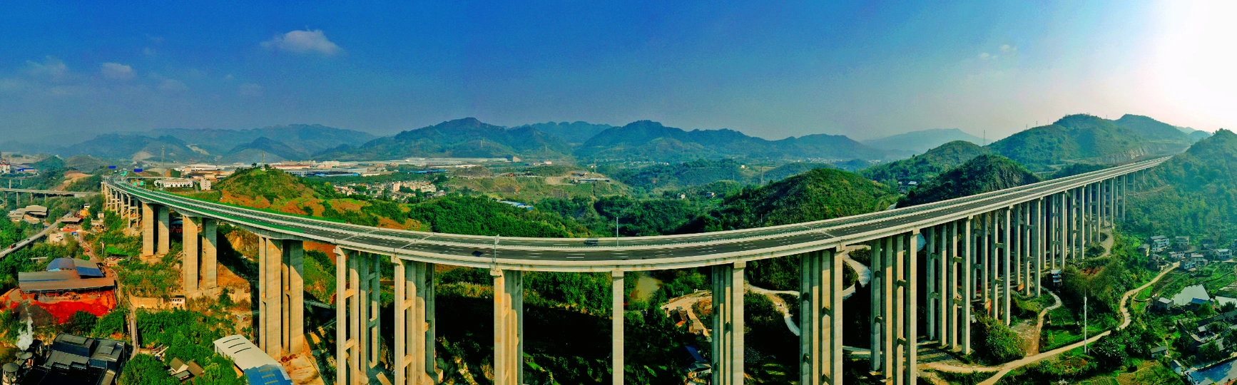 渝黔高速公路扩能项目(万盛段)万盛特大桥,桥墩高耸、大桥飞架。该桥全长1415米,最高墩高达78米,共32跨,位于万盛经开区南桐镇温塘村,是渝黔高速公路扩能项目重难点控制性工程,也是万盛境内唯一采用“T梁+连续梁+钢箱梁”的特大桥。 作为重庆城市提升交通建设三年行动计划重点项目,渝黔高速公路扩能项目全长约367公里,重庆段全长99.948公里。该高速公路是继渝蓉高速之后,重庆第二条全线设计六车道的高速公路。全线建成贯通后,将实现主城都市区内部各区与市外的互联互通,并极大改善既有渝黔高速的拥堵状况,形成重庆高速公路网南北主轴的重要通道与向南经贵州直达广西的出海高速通道。