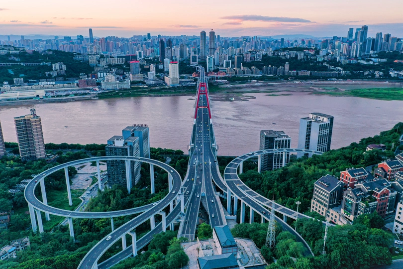 拍摄于南岸区苏家坝立交,苏家坝立交、菜园坝大桥、长江与都市林立的高楼构成重庆独特的山水之城。