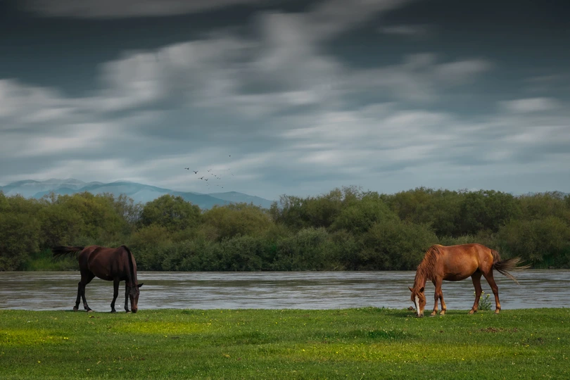 晴朗的天气,昭苏湿地公园里,两匹天马正在河边悠闲地啃食青草。天上云朵悠悠。