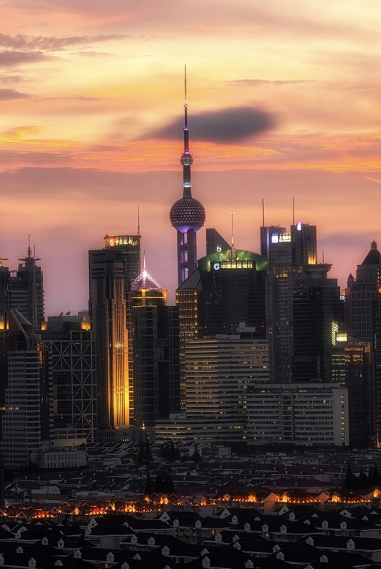 日落的火烧云霞映红了整片天,东方明珠亮灯代表着夜色的开启,使用Nisi CPL ND64延长曝光时间,流云有了动感
