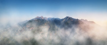 清晨5点多徒步出发,独自爬上黄山脚下的一处山谷高地,无人机起飞后可以看见天都峰、莲花峰两座并排的主峰,以及右侧的光明顶等景点。高山、薄雾、晨光组成了一副独特的的黄山画卷。