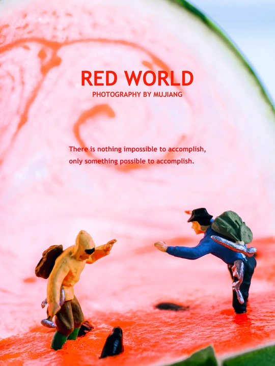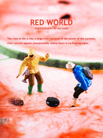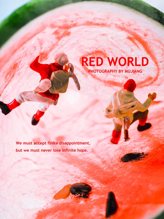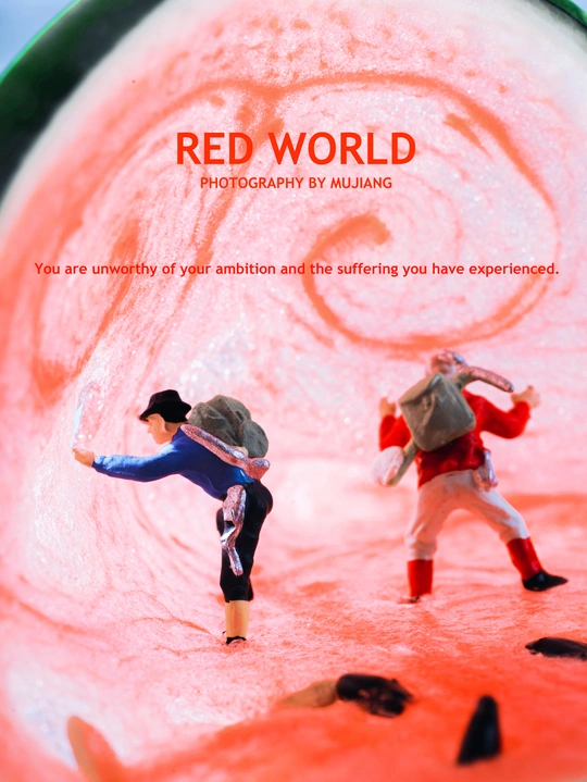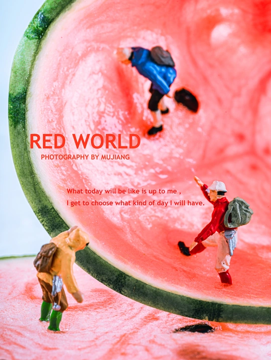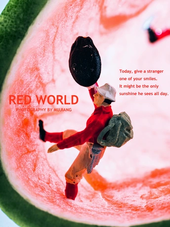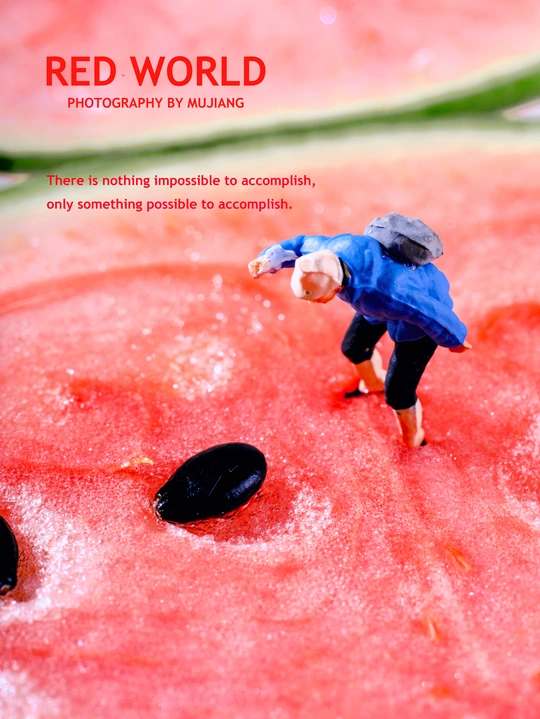 西瓜?里的世界简直太精彩了,不仅有眼睛?,还有孙悟空的紧箍咒。这么精彩的世界,我的小人怎能错过。 他们又偷偷爬到了西瓜?的世界里,找寻西瓜?内的宝藏,一颗颗小小动物西瓜籽也是他们的猎奇目标。 拍摄总结: 如果有灵感,拍出来还是不难的。但是在最后的修图上遇到了些问题。西瓜是橙红色的,里面有橙色甚至有黄色,最开始修图时,出来的图片显得很暗很黄,最后通过在高光和阴影中添加青色降低黄色,让图片显得通透不那么黄。 @米拍社长 @米拍