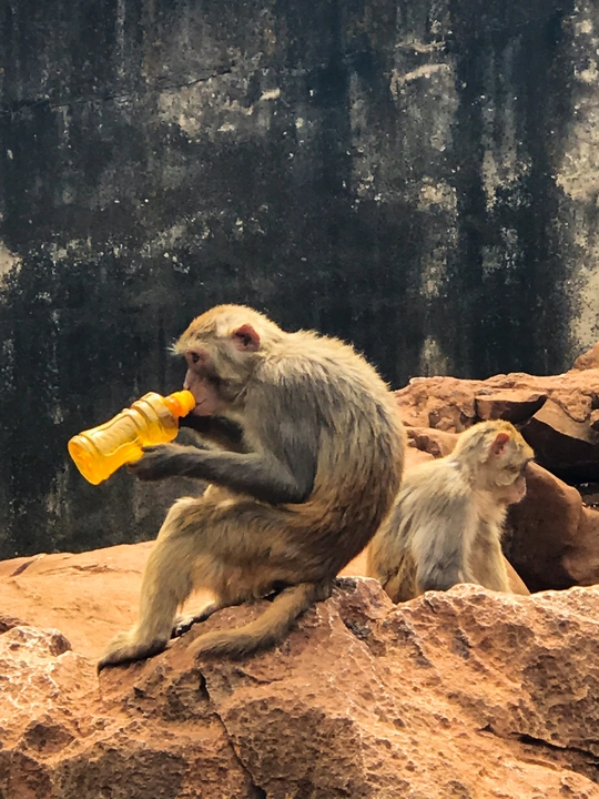 动物园的小猴在人类的熏陶下喝上了瓶装饮料。