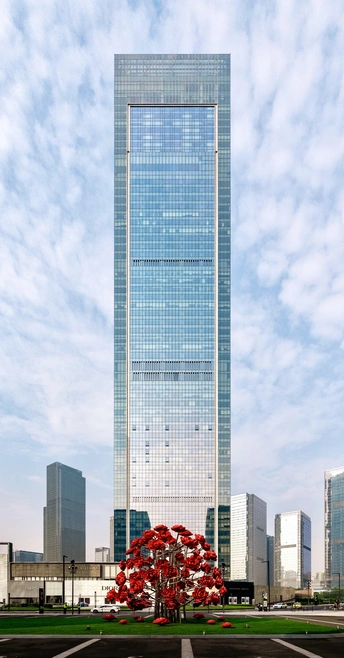 重庆国金中心的标志性雕塑花前,运用超广镜头在狭小的空间内把广场和大厦装在一幅画面里。