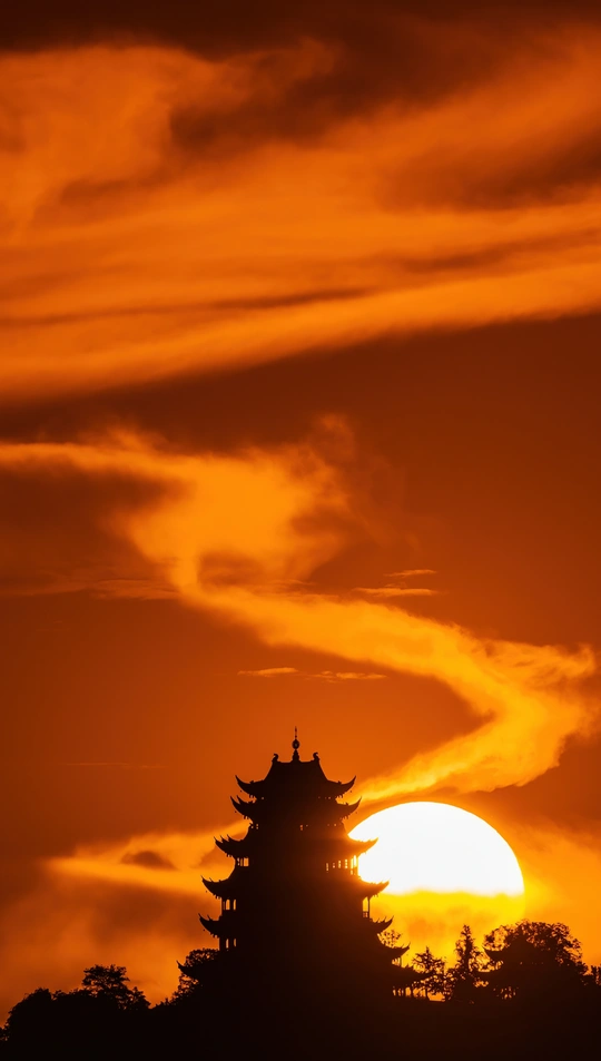 烈日当空,和小伙伴计划好拍摄鸿恩阁日落,奈何天不遂人愿,日落时分总会有厚云层遮挡,连续蹲守了4天,却拍到了如此神奇景象。云层在夕阳的映照下变成了如烟一般,加上残阳作伴,鸿恩阁显露出一种神秘感,犹如一座不为人所知的宗派的阁楼。