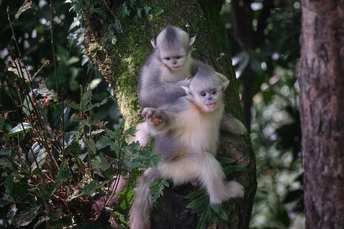 塔城香格里拉滇金丝猴国家公园的滇金丝猴一家子,幼猴的毛色是灰白的,成年后逐渐变深,唇色“色号”也越来越粉红。长松萝是它们最喜爱的食物之一,幼猴活泼极了,边吃边玩、上蹿下跳,成年猴则悠闲的细嚼慢咽,觅食后,一家子向山下移动,慢慢消失在我们的视野中。这次近距离观看了滇金丝猴,感觉猴子也有“猴品”,滇金丝猴温文尔雅,跟我们始终保持着安全距离,不像“弼马温”猕猴,又抢又挠,据说当地人说也不会偷抢农作物,真是一宝🐒