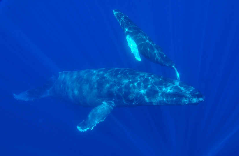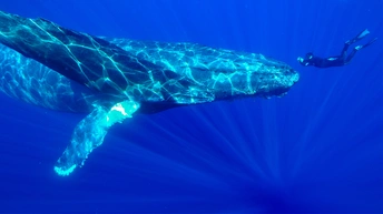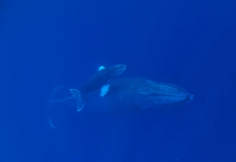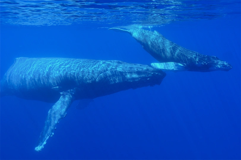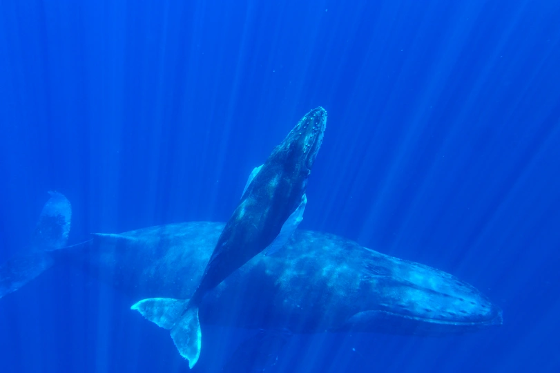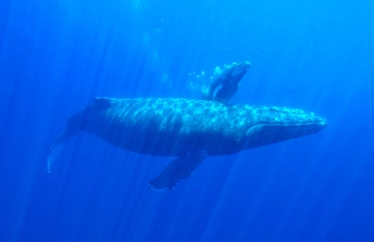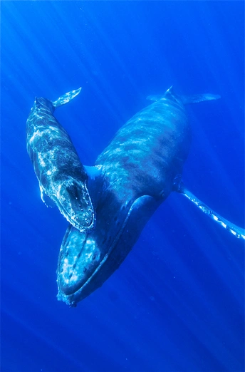 在墨西哥最著名的潜水胜地socorro拍摄到的座头鲸妈妈与baby… 这个baby非常的调皮,在妈妈身边钻来钻去,时而跑开…但是也不敢离妈妈很远…妈妈近距离打探过我们几个潜水员…证明没有危险后也很享受的在海里翻滚… 画面十分和谐 @米拍社长