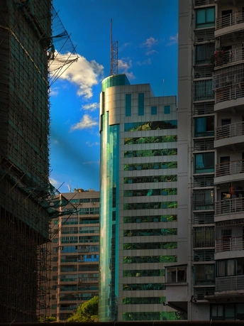 楼宇之间,高低错落,一缕阳光照射进来,对比感由此产生。