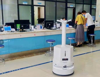 当前疫情形式严峻,每日大厅内人流量极大,做好消毒工作是非常重要的。故此,在大厅放置一台智能消毒机器人,提前设定好消毒路线以及消毒时间,保质完成每日两次的消毒工作。