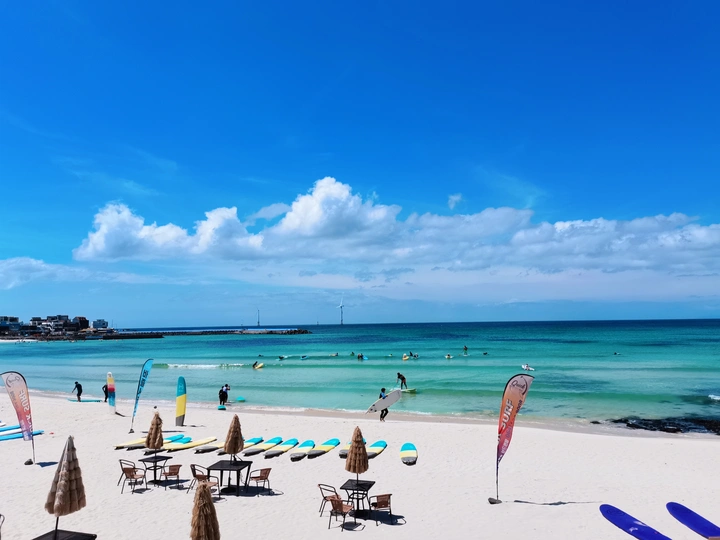 济州岛的机场就在海边 可以拍到飞机在海上飞过的照片 济州岛的蓝天白云 金色沙滩 让每个韩国人都向往不已