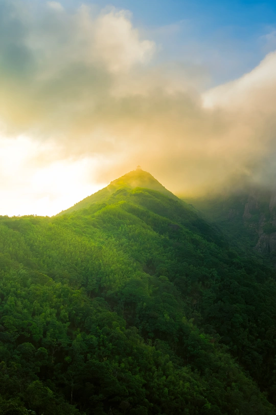 三个小时的负重跋涉,对于我这样户外小白来说真是不太吃得消。山顶的雾气很大,对面的山峰随时会隐没在雾海之中,好在运气不错,在它完全消失前,拍到了一张山峰与雾海的合影。