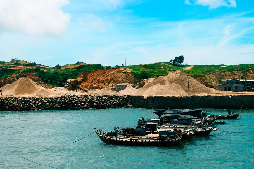 遇上海洋休渔期,渔船整齐排列,停泊在海湾,由此也构成了一道风景线。