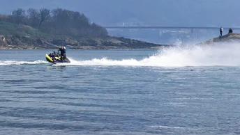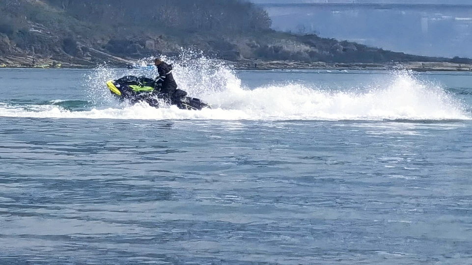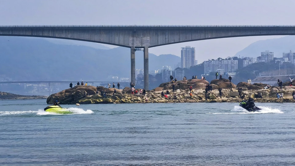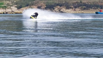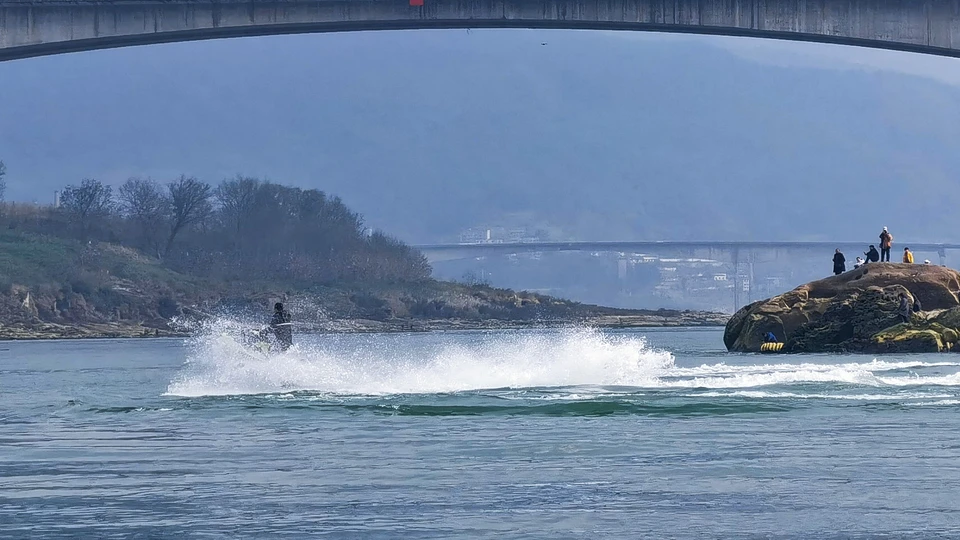 北碚金刚碑古村落的江边,年轻人驾驶摩托艇激起层层浪花,就是这城市不屈的精神。