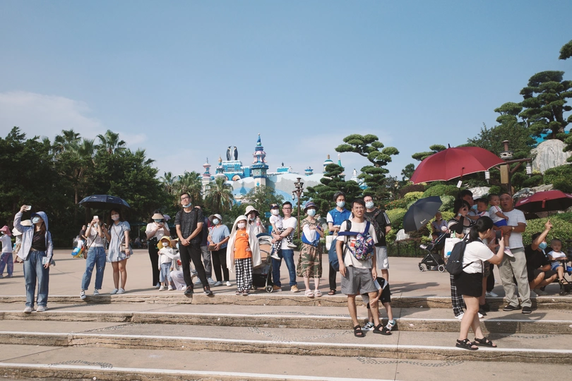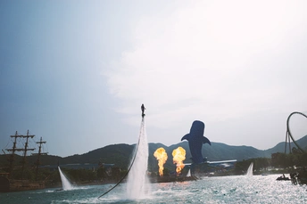 珠海长隆海洋世界,水上冲浪的表演者和岸边的观众。