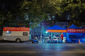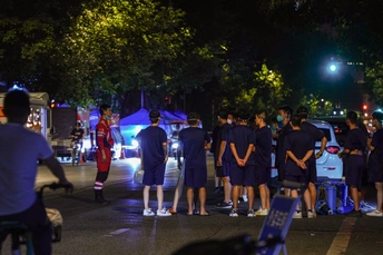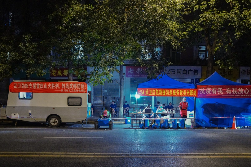 成都市成华区双桥子街道封控区内 刚支援重庆山火凯旋而归的四川武卫应急救援队已经入驻开展救援消杀