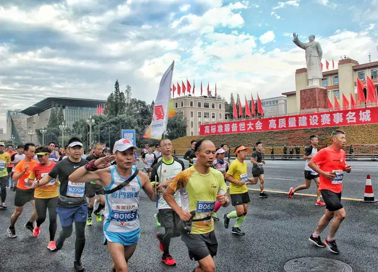 成都马拉松上,运动员经过天府广场时向毛主席像敬礼。运动健儿的不断挑战自我的精神值得我们学习,我运动我健康,青春无极限~