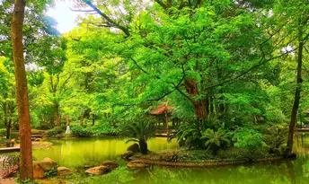 都江堰景区,一个中年女子从绿意盎然的树林走过,格外有夏天的气息