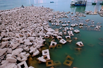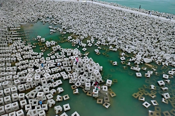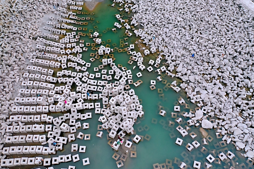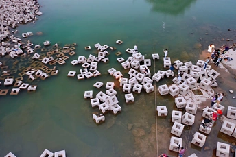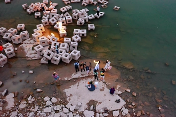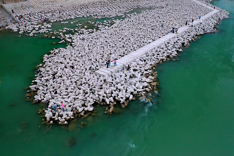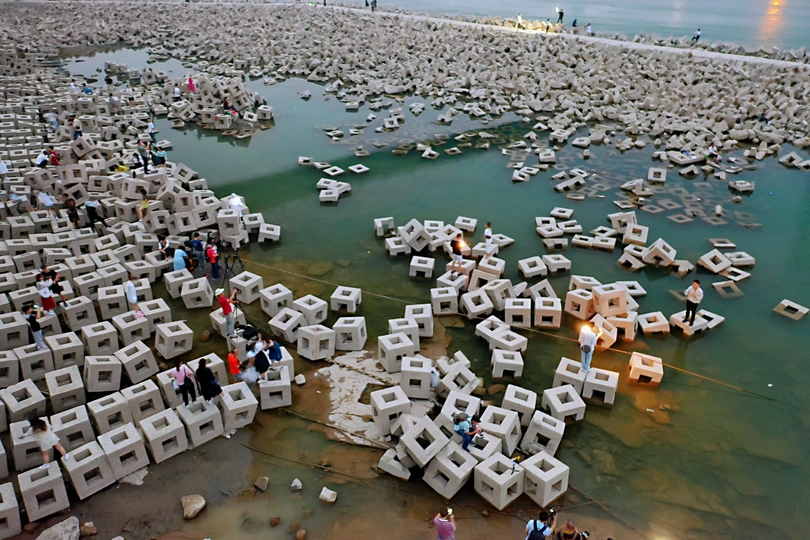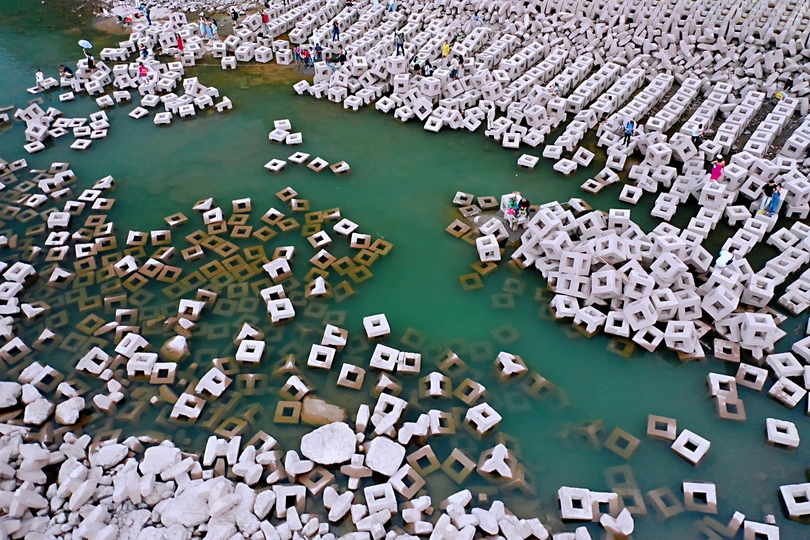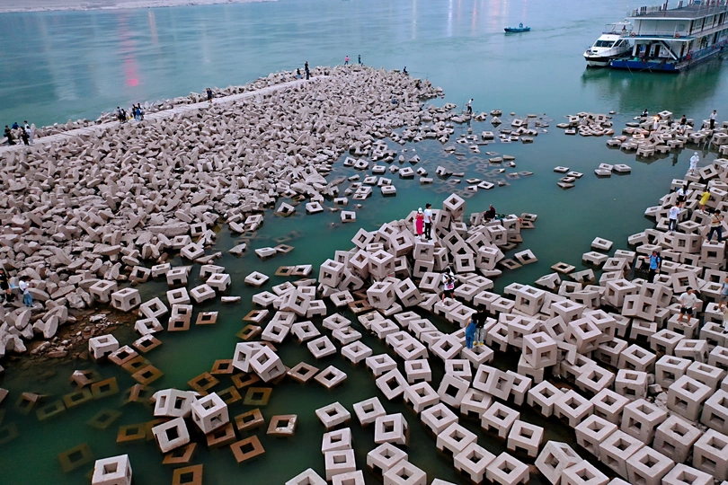 重庆,今年夏天连续高温,长江水位下降,露岀了江中的防护石桩,给你不一样的美。