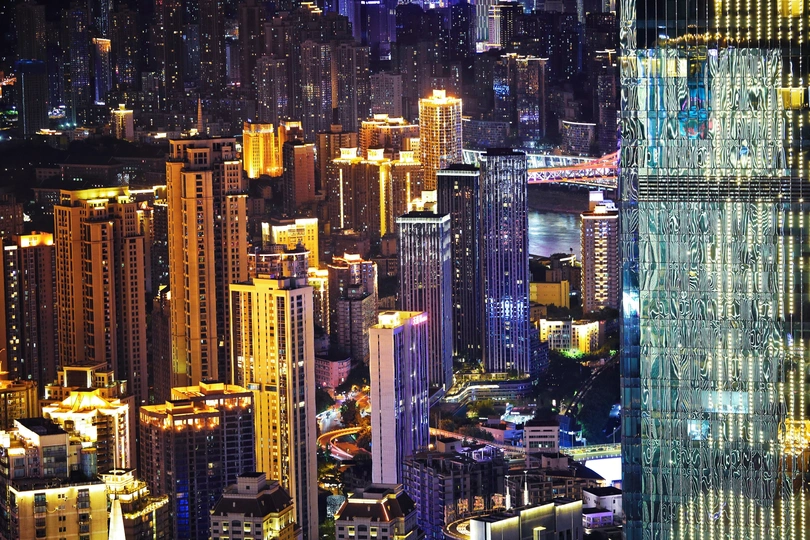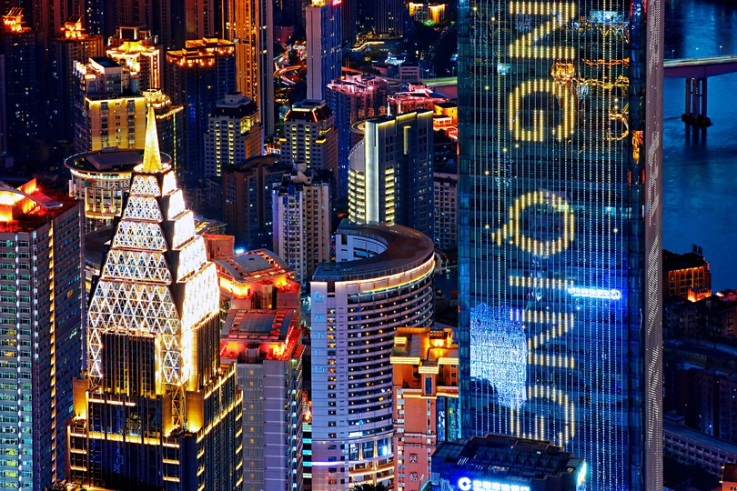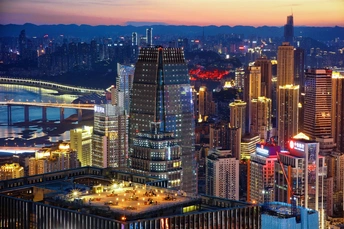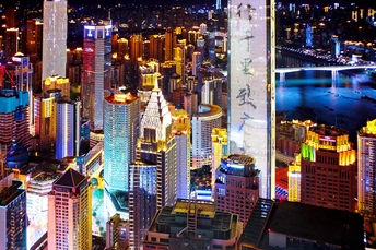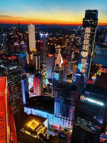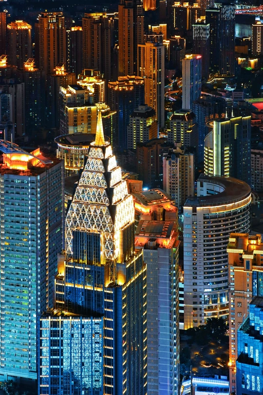 夜凭栏望,楼山起伏 华灯璀璨,星光连城 嘉陵汇长江,湍急东流去 汽笛声里楼也移,白玉凭栏醉伊人