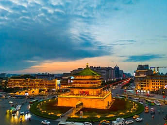 历史悠久的西安钟楼穿越时间立在车水马龙的十字路口中间,是西安独特的城市名片