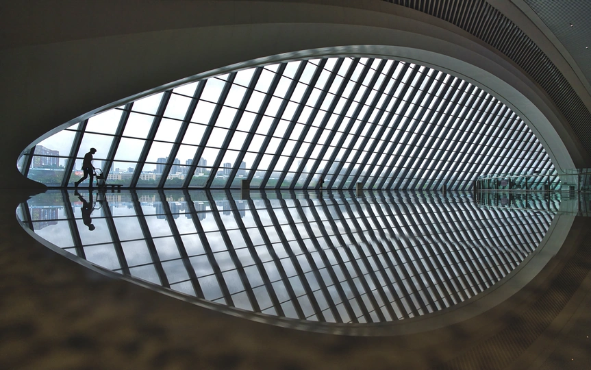 忙碌的年轻人行走在充满科技感的全景落地玻璃之下