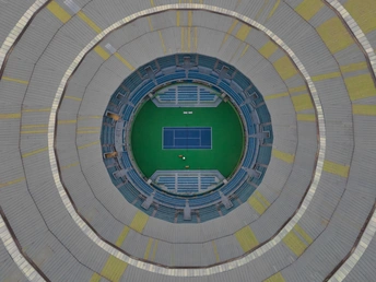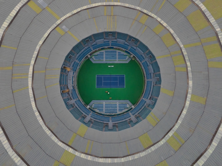 摄于广州奥体中心。 后期使用建筑物的圆顶充了四边的地景,以突出中心。