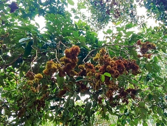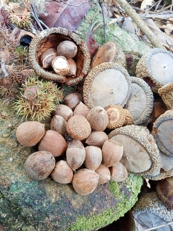 我们的目的地是半山腰。由于地处热带地区气候湿润温暖适宜很多植物生长,即使是现在十月份山林里的树木都是郁郁葱葱的,更别提通往山顶弯曲连绵的小道有多旺盛了。你看就连硕果累累的板栗树枝也不愿意撒开叶子的手。