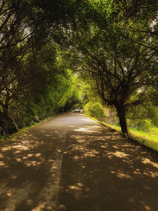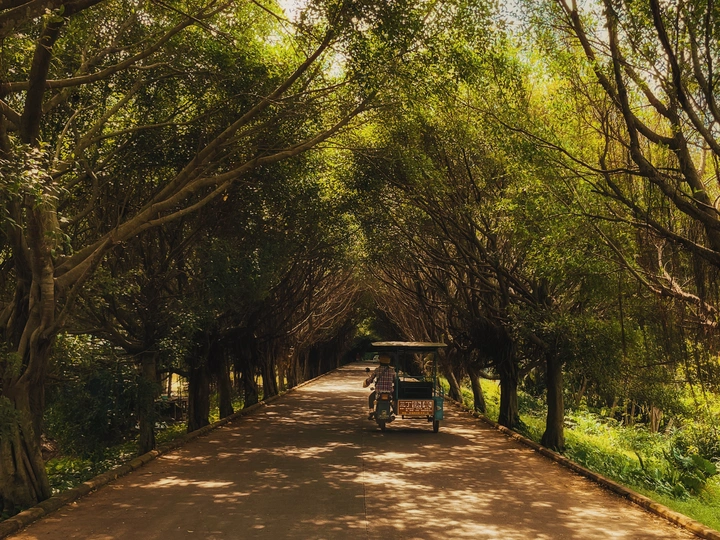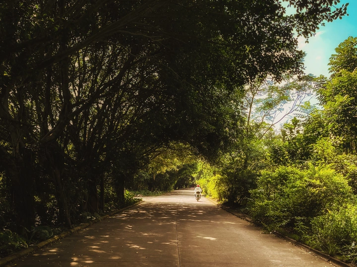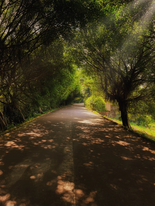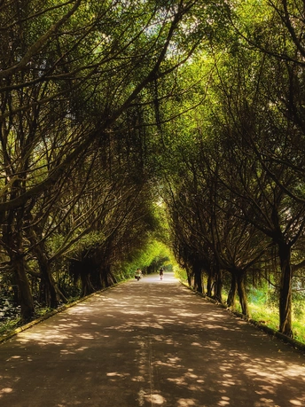 林荫大道位于海南师范大学附属中学西南门的对面。 林荫大道两旁葱葱郁郁的老榕树,老树向着道路中间交织延 展,仿佛形成了一条天然的“森林隧道”。 沿着林荫大道一直走,左边是乡村田野,清晨时候,空气清新自然。远处看过去是海南省最大的的河流一—南渡江,江景无限风光。右边是海南师范大学附属中学和分创村。 沿着道路的尽头还有一条架在南渡江上的废旧铁桥,也很值得一看啊。 如果是清晨和傍晚骑行通过此处,一定会是不一样的感受!