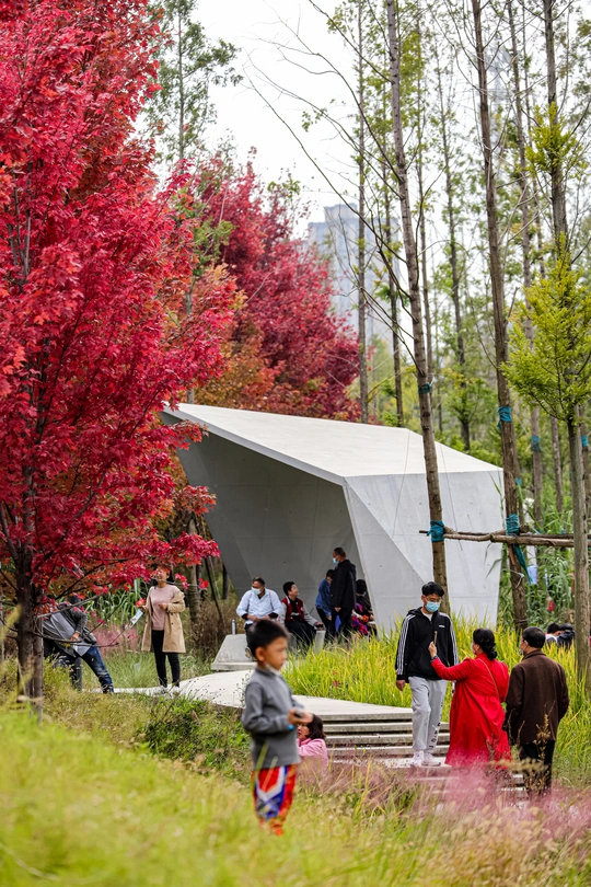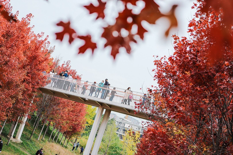 这几天一直刷到家门口的神仙公园,可能是离得比较近就一直没有去拍,趁着周末的功夫去打卡了这个已经红叶漫漫的宝藏公园,喜欢的小伙伴们可以冲了[嘻嘻][嘻嘻][嘻嘻] ?:雁南公园溪谷园内,导航金地中央公园售楼部,就位后,马路东北方向就可以看到整片的红叶了。可以从廊桥上观赏,也可以下到公园里面拍摄观赏。 PS: 1. 红叶最近开的比较好,有兴趣的小伙伴们赶紧来打卡。 2. 雁南公园整体比较大,从北向南依次是西沣园,生态园,溪谷园和杜伯园:红叶和部分粉黛多在溪谷园内,此外还有荻花。西沣园内银杏较多,目前没有黄很多,可以再等等。杜伯园内以草坪为主,适合露营和散步,也零星有些粉黛和芦苇。 3. 考虑到人流量,可以携带70 200的长焦镜头,拍摄起来可以尽量规避掉较多的人群。 4. 不清楚具体位置的小伙伴可以私信或者评论。