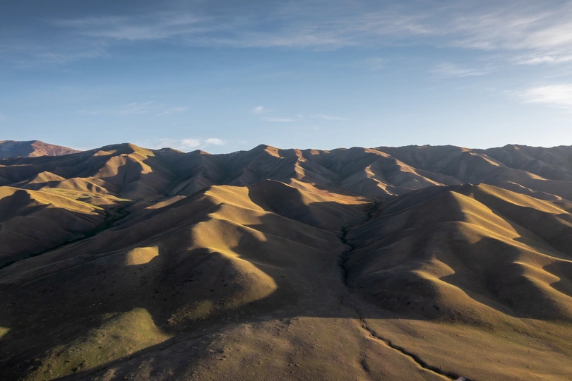 新疆维吾尔自治区 巴音郭楞蒙古自治州 和静县,初升的阳光照亮巴音布鲁克草原上隆起的小山包。