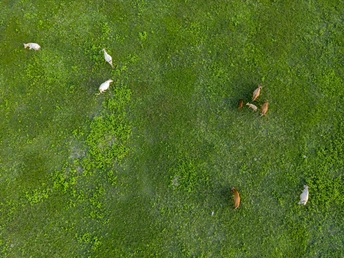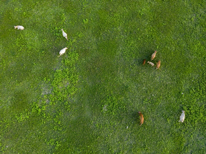 在黄河边上,水位下降时露出平坦的滩涂,长了一层翠绿的小草,这就成了牛儿们天然的牧场。
