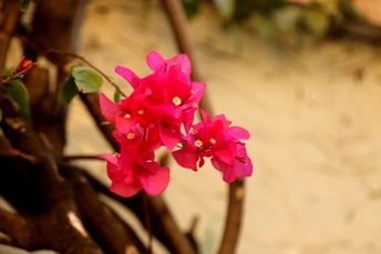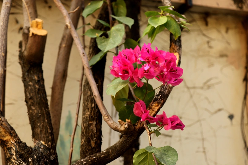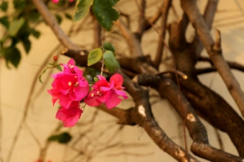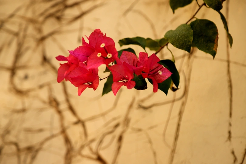 簕杜鹃又名三角梅,也可以说是红梅。照片背景有古画纸张发黄的色调,以及古画树枝褪色笔墨的色泽。这些,使它们成为传统梅花画风格的照片。