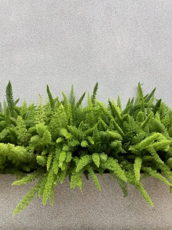 一个旧改小区里,颇具年代感的墙角下栽种了一排绿植,长得很茂盛,生机勃勃的样子