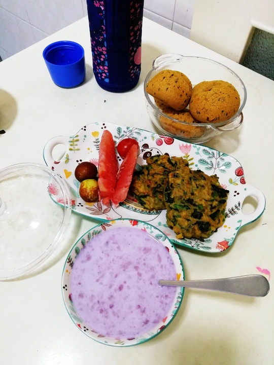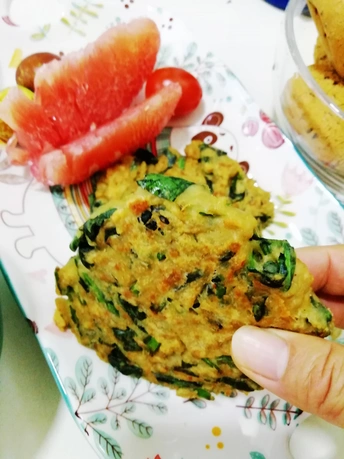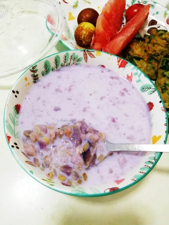 今日份懒人早餐:紫薯燕麦牛奶粥,菠菜猪肉饼,红柚子水果。拉满早餐仪式感。