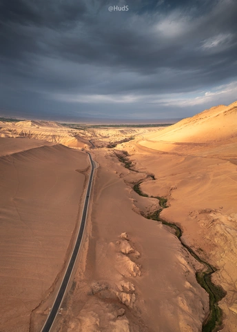 新疆维吾尔自治区 吐鲁番市鄯善县,吐峪沟乡,联通连霍高速和麻扎村的公路沿着与之平行的小河一起穿过火焰山。 吐峪沟是我在吐鲁番去的唯一一处位置,夏天的吐鲁番是中国最热的地方,而常年平均超过40度的吐鲁番却在我即将离开时飘来了乌云,也算是非常难得