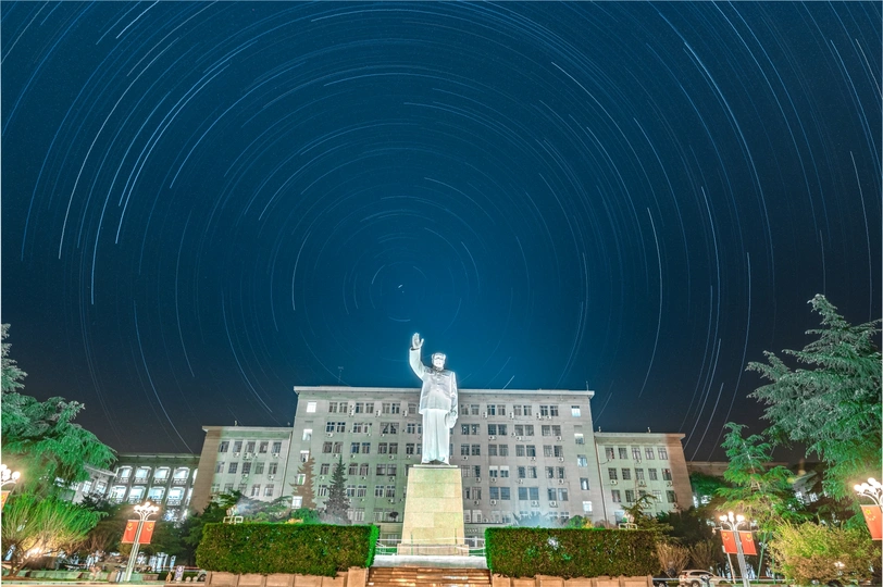 终于,和Ph.D赵、M.Sc王在华中科技大学南大门拍到了毛主席雕像和星轨延时。因为光比实在太大,于是第一次在星轨拍摄时使用了GND渐变减光镜用来消除下方四个超级探照灯。 后期在堆栈时,通过不通透明度,形成渐变星轨。 📷 设备:尼康Z6+腾龙17-35二代(三脚架:Fotopro空气三号;滤镜:NiSi GND0.9+True Color CPL) 📡地点 :华中科技大学南大门 🌃 曝光信息:20mm f4.5 S2.5s×494张 ISO320 后期:Lr统一调色 PS星轨合成(最亮,3.3%渐变0-99.9%)