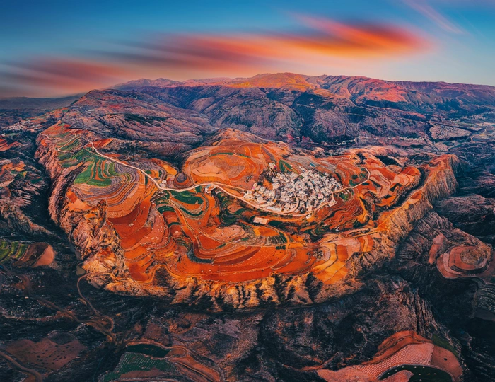 云南东川红土地,就像遗落的调色板,层层叠叠、错落有致。红色的土地、绿色的青稞,散落在田间的村落如世外桃源。落霞沟无疑是最美的风景,鬼斧神工的沟壑之上,坐落着美丽的村庄,航拍全景大地犹如金元宝,让人感叹大自然的神奇和人民的勤劳。
