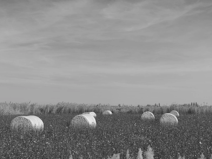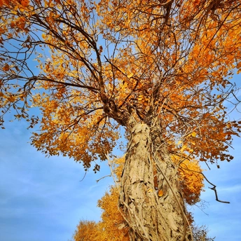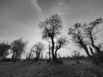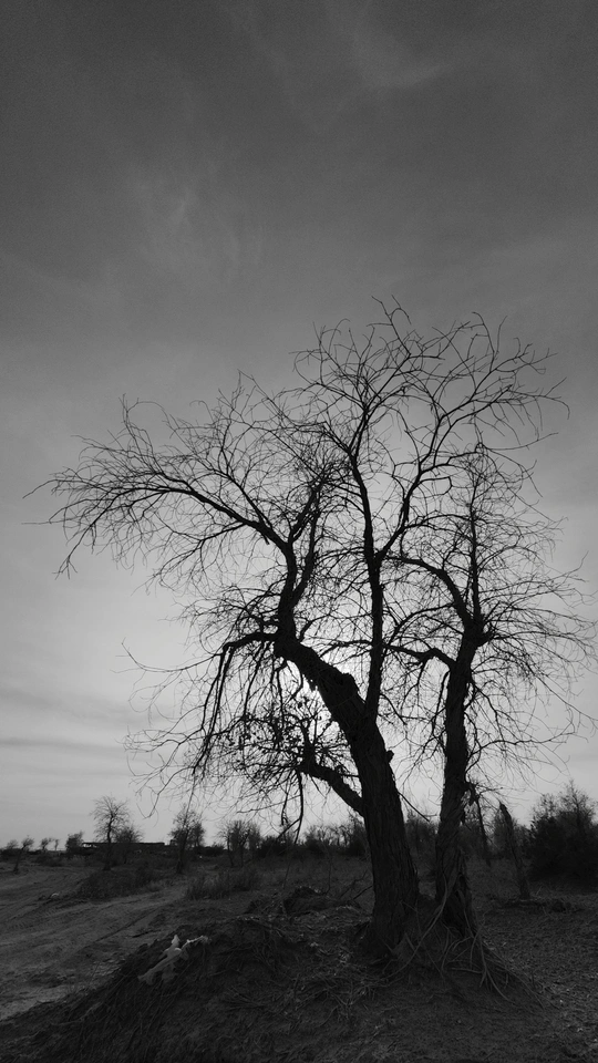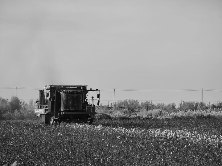 处在南疆的沙漠边缘,这里有着大量的农田和荒漠戈壁,棉花采收的季节,采棉机不分昼夜的在棉花地里采收,田边留下一卷卷打包成捆的棉花;远处便是一片胡杨林,这时的树叶也基本落下,健康的胡杨树正闪着金黄的树叶,枯死的胡杨历经风雨仍屹立不倒,诉说着这荒漠戈壁的凄凉。