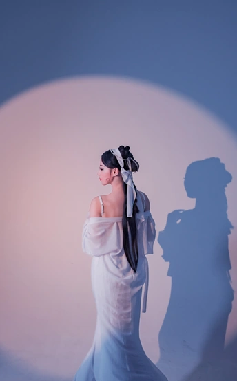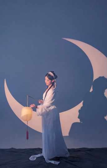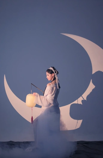 天利数码俱乐部人像拍摄活动,扮演白蛇的模特,提灯背景用束光打光月亮🌙造型拍摄。
